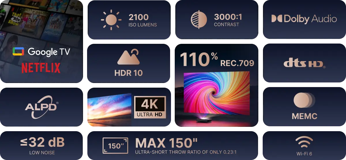 Add some ambient light and still enjoy immersive entertainment with up to 2100 ISO lumens of projector brightness.