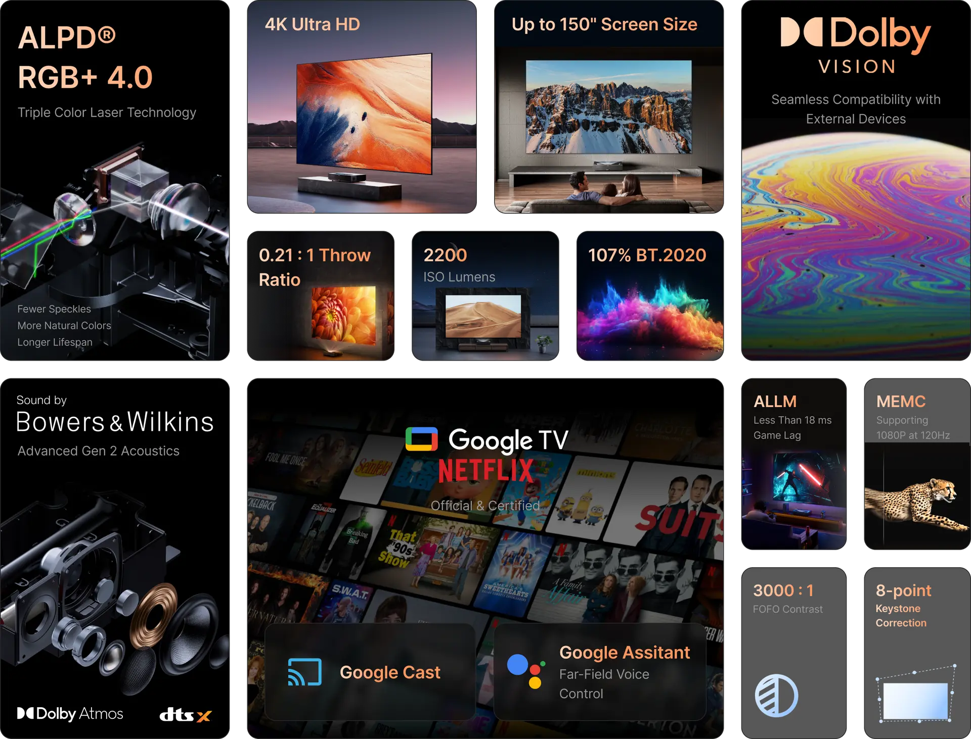 Theater Premium features a standout throw ratio of 0.21:1. This allows you to enjoy the same large screen from 18% closer, or upgrade to a screen that’s 40% bigger without moving the projector for a 100-inch projection, making it easier than ever to create a stunning cinematic experience at home.
