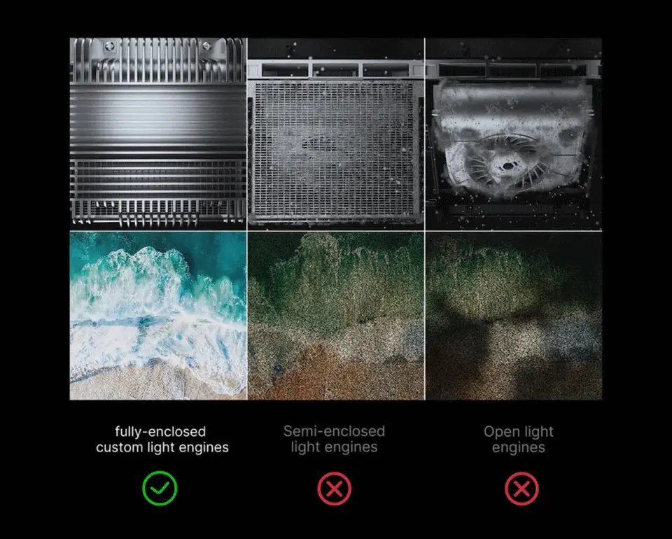 We’ve eliminated the three major issues that come with semi-enclosed light engines. Say goodbye to light leaks, dust spots, screen burn, and disruptive cooling mechanisms.